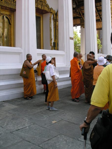 A Buddhist monastery was right next door, so we decided to stop in and take a look. This was a very good decision because there were very few non-monk people wandering the complex. It was an actual working monastery. Buddhist monks, robed in shocking orange sheets wrapped discretely about their naked bodies, roamed the complex and in deep meditation. I learned later that monks are not permitted to touch a woman and, conversely, woman are not allowed to touch them! I noticed that each time we passed a monk, he would avert his eyes from us. I also learned that Buddha is revered for resisting temptations from the earthly world, which very much includes women. The monks' goal is to imitate Buddha, which means women are off-limits. However, I did see some 'techie smart' Buddhist monks at the Grand Palace and they let me take their picture. They were very young and enjoyed the attention we gave them. After the shot, I gave them a 'thumbs up' and they smiled broadly. The monks at this monastery were older.