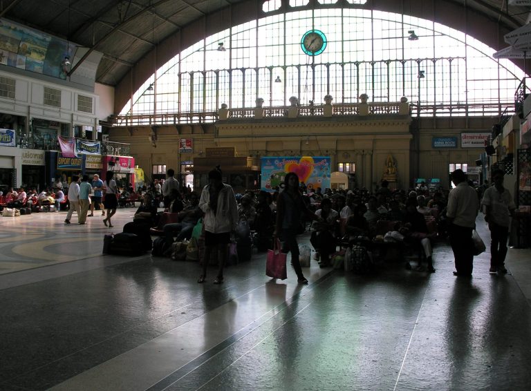 Bangkok city, at 5 a.m. was beginning to wake up. Vendors on the street were preparing for another full day of calling out to passersby. As we neared the train station , saw that the city is arranged just the opposite of U.S. cities. We are familiar with urban sprawl, whereby the poor remain behind while the more affluent radiate out to the outskirts of the city. It is just the opposite here. The poor live in shanty towns that surround the city. I viewed so many of the inside of these shanties, because many of them have large openings. Dirty rags cover the open windows for privacy. The poor were busy at work gathering their wares or making new wares or dishes to be sold that day. The sight was ugly to behold.