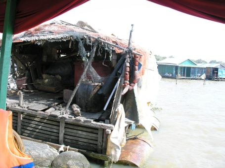 Soon we were in the thick of the floating village. They had everything that a land village would have, even a school and churches! The only churches there were two floating Catholic churches;surprisingly there were no floating Buddist temples. The schools were very modern and enclosed in wire metal mesh so, I assume, the kids wouldn't fall off and into the water. The houses were a model of utmost poverty. Our guide told us that their occupation was fishing and that is why they lived on the water. He said that they could improve their lives, but they were lazy. He said that he, himself, was a product of a floating village but has earned enough money to go to school to be an English speaking guide for tourists. He said that they could improve their conditions, but they lack the desire to do so.