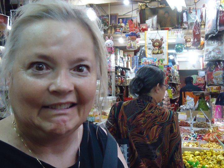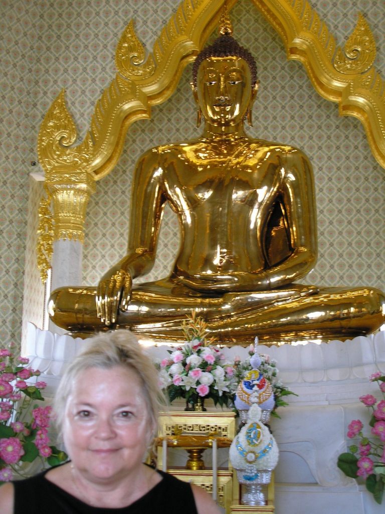 The air was heavy and humid by this time of day. I was sweating profusely! We finally found the temple and it was smack in the middle of Chinatown. This area of town was known for its markets and the stalls lined every possible space on the sidewalks. I was happy that the temple area was surrounded by ample concrete patios that were devoid of the crowded conditions on the street. This was the Temple of the Big Golden Budda, renowned for not only its immense height, but it was also covered in the purest gold. We learned that the interior was made of clay and mud, densely packed together to form the Budda.