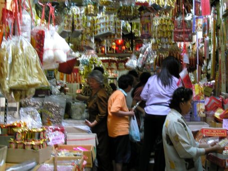 We decided to walk to the bank instead of using a local tuk-tuk (an open air buggy powered by an attached motorcycle). We strolled down the middle of the narrow street because the sidewalks on either side were loaded with merchants selling their wares. "Ah!", I thought, "These are the sources of the noises I heard as I lay in bed." All kinds of items were being hawked. About 50% of the stalls offered food for sale, anything from fruit to grilled chicken. The road appeared very dirty underfoot. Locals seemed to walk aimlessly past us with no particular destination. It was mostly men who wandered about. I saw that the women and children stayed within the covered stalls, many of whom remained even behind the stalls carrying on daily functions, such as combing their hair, creating more items to sell or simply idling away the hours watching the foot traffic.