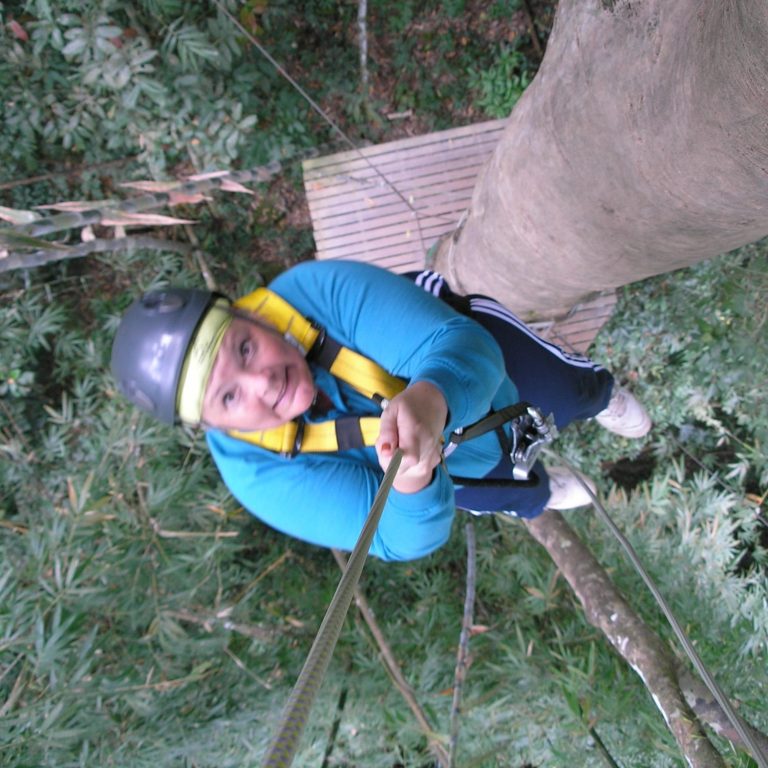 When we arrived high atop the rainforest mountain, the zip-line crew covered our hair with a yellow handkerchief. Two Australian college girls on holiday and a young couple from Malta were also in our group. Already we looked like someone on the T.V. show Survivor. We looked cool. Then we were fitted with harnesses, that I noticed were nearly brand new. That was a mental check in my mind for safety. Finally, we were outfitted with helmets (another check for safety!) and sent to a small platform to, I thought, was do some training or a small practice run. NO! My daughter went flying through the air with so many smiles on her face. Then it was my turn! I saw that the cable was about 30 ft off the ground. I started to whimper. Everyone in our group of 6 kept chiding me to go! I was so scared. In the past, I usually shut my eyes when high above the ground and this usually helps. So, I decided that I would do this the entire time.